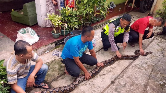 “Ular itu melingkar di batu dalam bak penampung, sekitar 6 orang yang bantu narik ular itu keluar. Awalnya sempat akan di bunuh, tapi polisi melarang. Akhirnya setelah 4 jam baru ular itu bisa keluar,” lanjutnya.