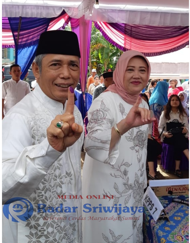 Foto H Iskandar SE didampingi istri pada saat menyalurkan hak suarannya di TPS 6 Jejawi
