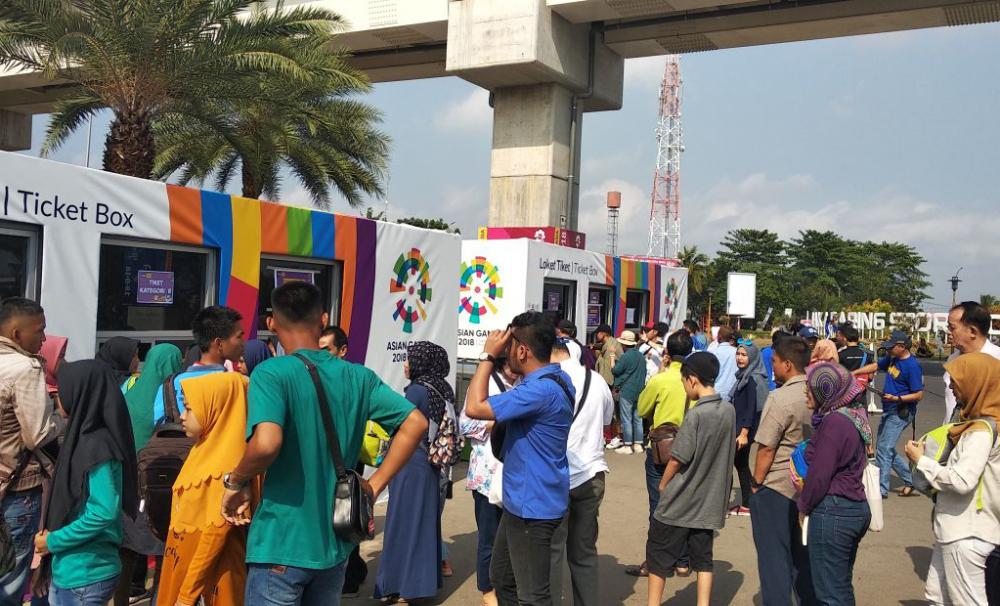 Radar Sriwijaya – Animo masyarakat yang akan meyaksikan hari pertama Asian Games 2018 sangat tinggi, hal tersebut dapat dilihat dari panjangnya antrian di lokasi pembelian tiket yang berada sebelum masuk komplek Jakabaring Sport City (JSC) Palembang. Sayangnya, masyarakat yang mengantri untuk mendapatkan tiket harus berpanas-panasan karena pada tiket box itu tidak ada tempat berteduh.