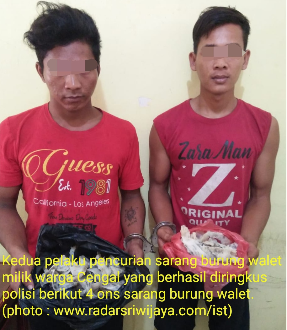 Jonli alias Jojok (22) warga Desa Cengal Kecamatan Cengal dan Revo Mekoldo (22) warga Dusun IV RT 004 Desa Tulung Selapan Ilir Tulung Selapan OKI, ditangkap berikut barang bukti sarang walet yang dicurinya serta 1 bilah senjata tajam jenis parang dan tas ransel.