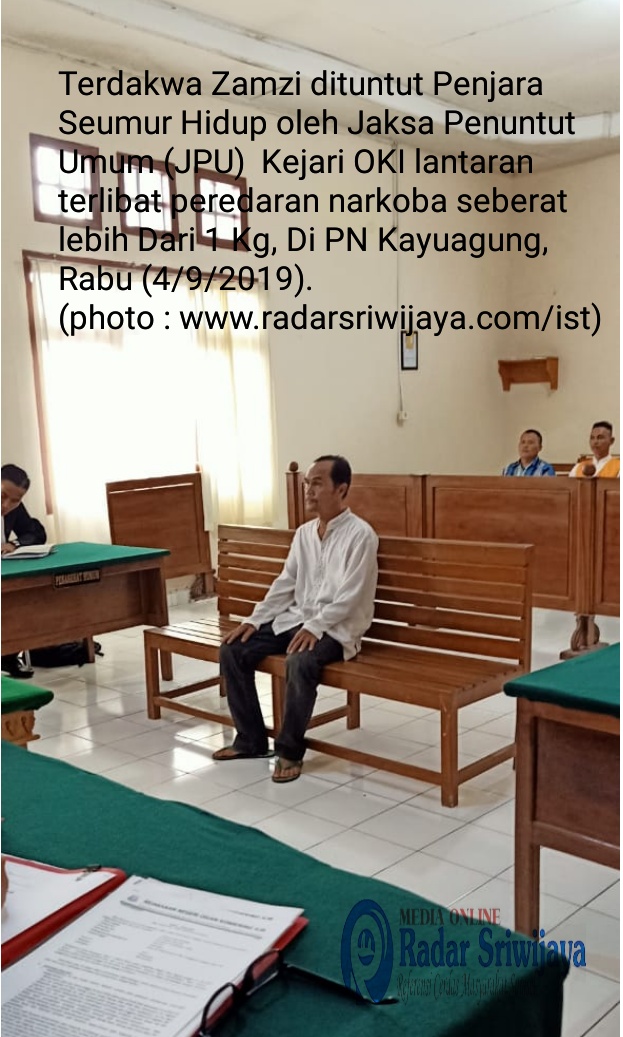 Radar Sriwijaya (OKI) – Seorang kurir narkoba asal Pekan Baru Riau, Zamzi Yusrizal (48) dituntut pidana penjara seumur hidup oleh Jaksa Penuntut Umum (JPU) Kejaksaan Negeri Ogan Komering Ilir (Kejari OKI) , Imran SH pada persidangan yang digelar Di Pengadilan Negeri Kayuagung, Rabu (4/9/2019).
