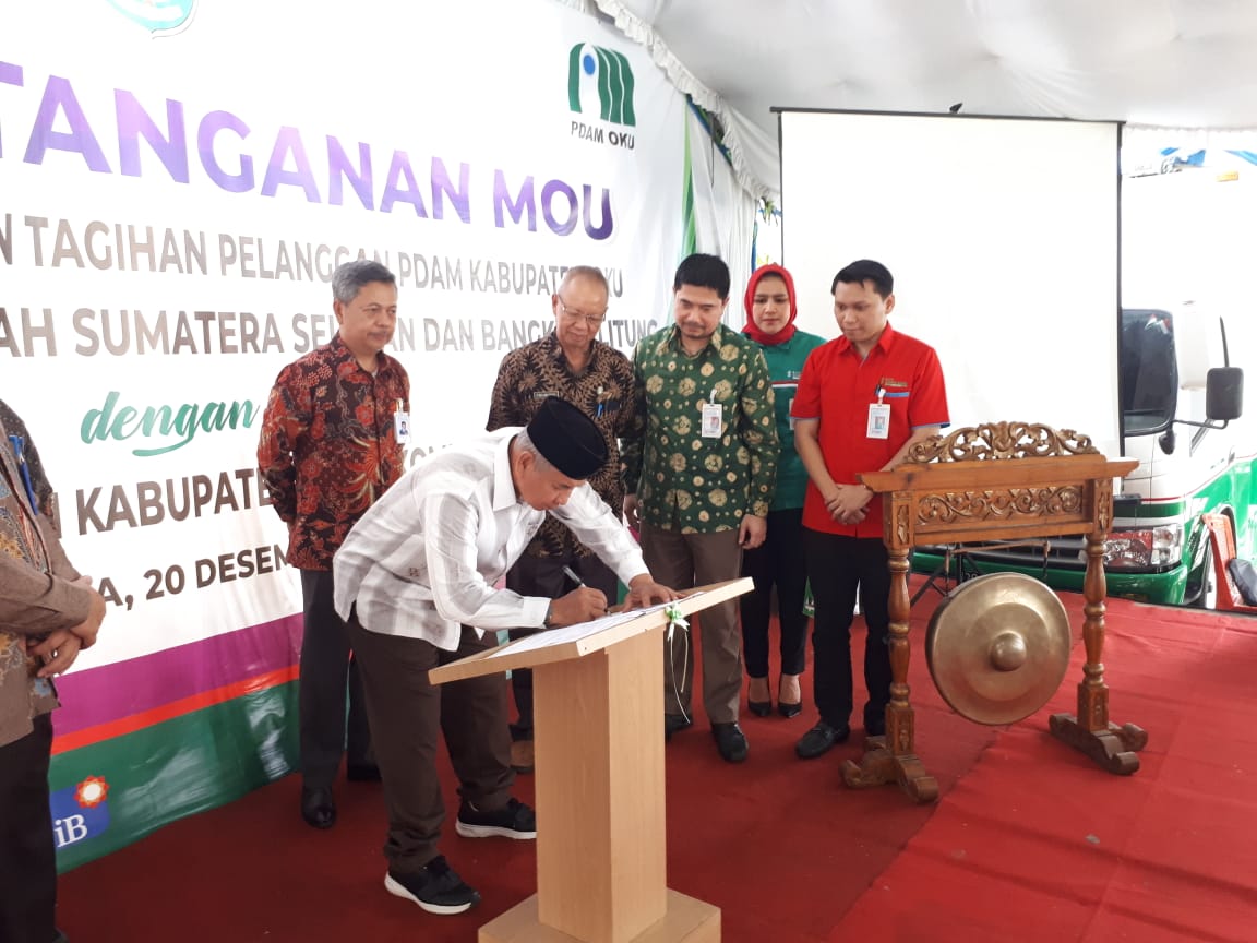 Radar Sriwijaya (OKU) – PDAM Tirta Kabupaten OKU melakukan Penandatanganan MOU dengan Bank Sumsel Babel Syariah dan sekaligus launching pembayaran Tagihan Pelanggan PDAM melalui bank bertempat di halaman Kantor PDAM Tirta Kabupaten OKU . (Jumat, (20/12/2019).