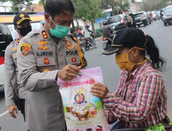 Photo : Kapolres OKI AKBP Alamsyah Pelupessy membagikan sembako kepada salah seorang warga.