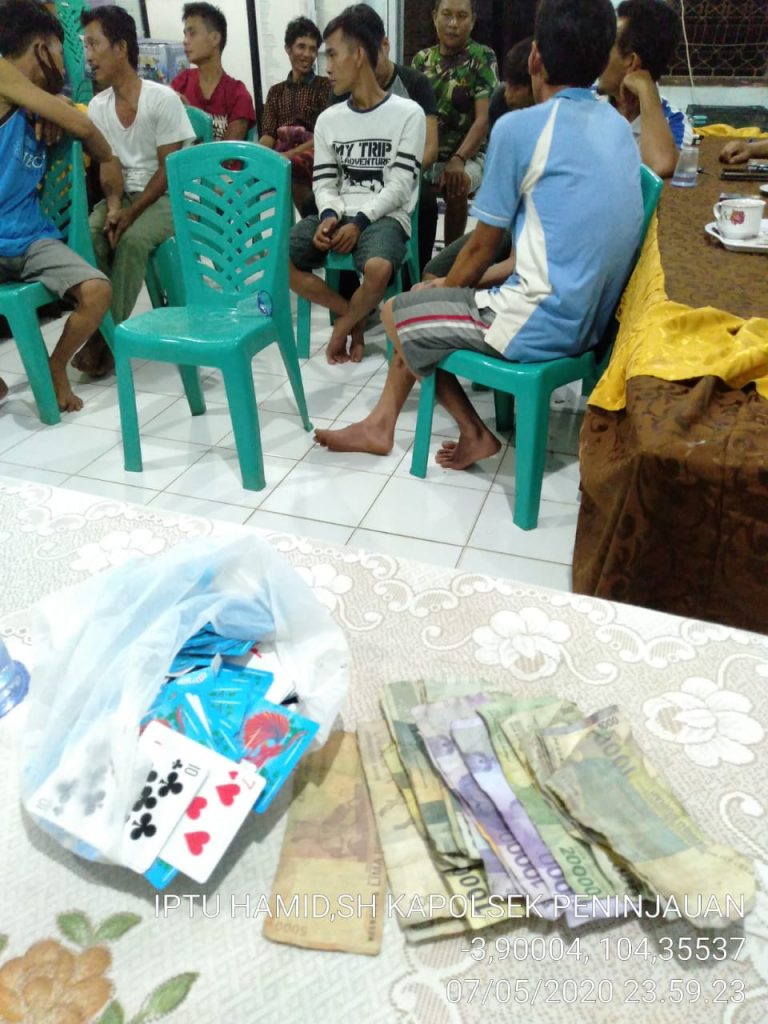 Penangkapan terhadap 10 orang warga Desa Karang Dapo berinisial Sd, Zul, Hi Jh, He, Ra, Kh, Ah, Bi, dan He yang sedang bermain judi tersebut dipimpin langsung oleh Kapolsek Peninjauan Iptu Hamid, S.H., bersama anggotanya.