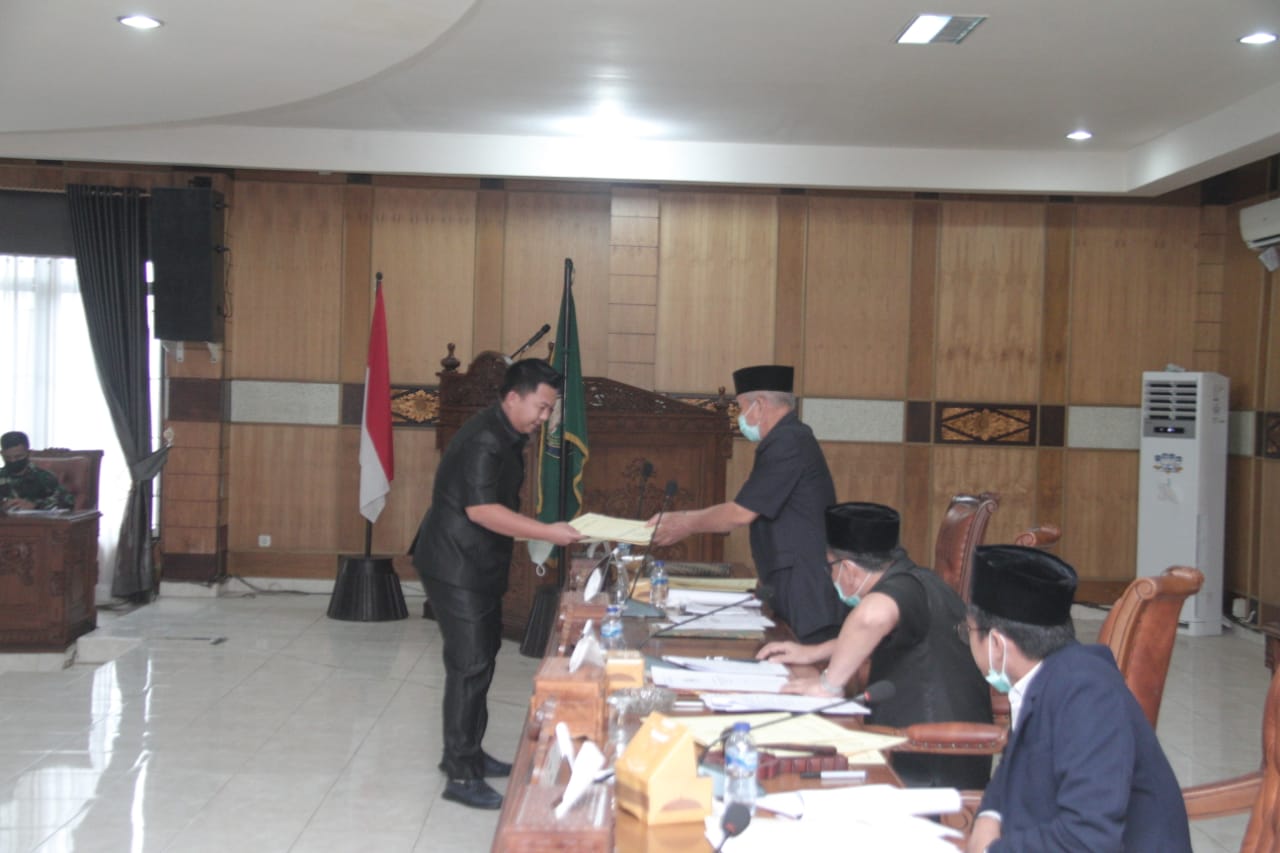 Fraksi Demokrat disampaikan oleh Yopi Sahrudin, SE, Fraksi PDI-P oleh H. Azuzandri, SH, Fraksi PKB oleh Densi Hermanto, SH, Fraksi Partai Amanat Nasional Oleh Ledi Patra, SP.,M.Si, Fraksi Hanura oleh M.Saleh Tito,ST, Fraksi Nasional Bintang Persatuan Oleh M. Fahruddin, A.Md, Fraksi Golkar Oleh H.Ridar Hariyuwono,SE dan Fraksi Gerindra Sejahtera Oleh H.Adif Kailani.