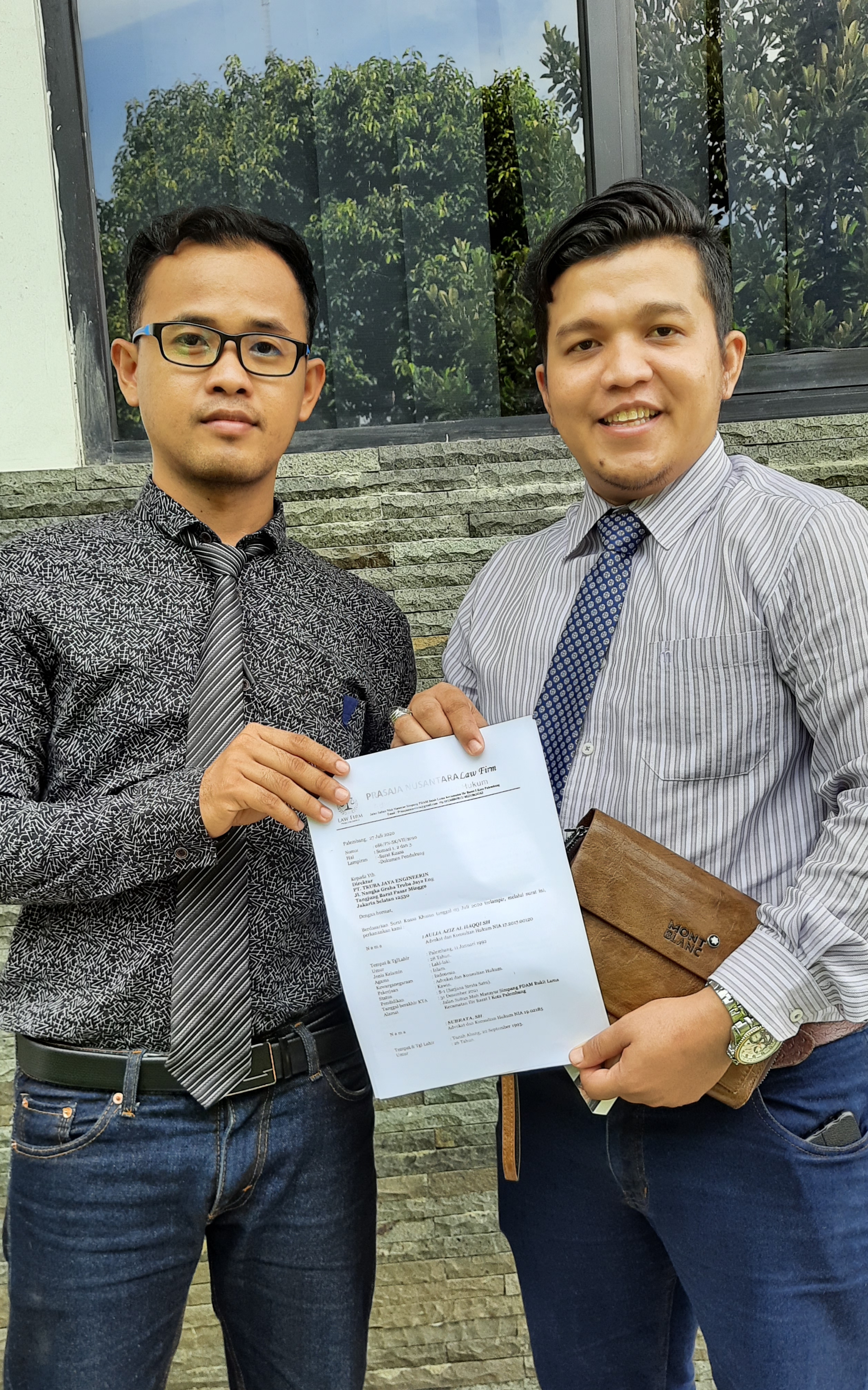 photo : Advokat Aulia Azis Al Haqqi, SH dan Subrata, SH memperlihatkan surat somasi yang dilayangkan ke PT Truba Jaya Engineeri.