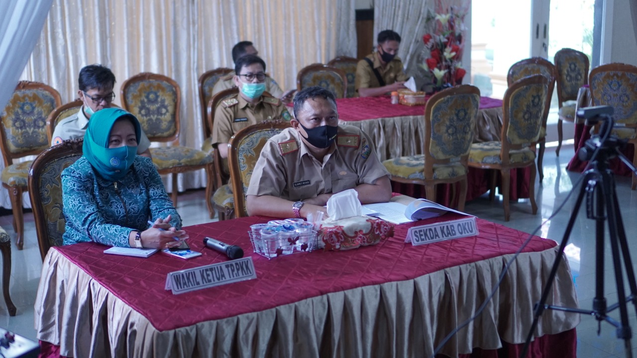Radar Sriwijaya (OKU) – Asisten I Bidang Pemerintahan dan Kesra Setda Kabupaten OKU, Drs. Slamet Riyadi, M.Si bersama Wakil Ketua TP PKK Kabupaten OKU mengikuti Vidcon Rakor Pencapaian Target Realisasi APBD Tahun 2020 dan Sosialisasi Perubahan Perilaku Hidup Baru (New Normal) Masa Pandemi Covid-19 Bertempat di Ruang Induk Rumah Dinas Bupati OKU (Senin siang, (10/08/2020).