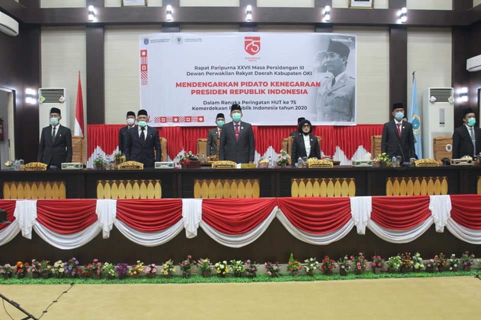 Radar Sriwijaya (OKI),-Pemerintah Daerah Kabupaten OKI mendengarkan bersama Pidato Kenegeraan Presiden Republik Indonesia di Gedung DRRD Kab. OKI secara virtual. Dalam kesempatan tersebut, turut hadir Bupati dan Wakil Bupati Ogan Komering Ilir, Pimpinan dan Anggota DPRD serta Kepala OPD dan Kepala Bagian di Lingkungan Pemerintah Kabupaten OKI.