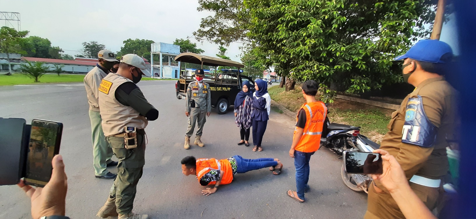 Photo : Salah satu penegakan disiplin dengan sanksi sosial yang diberikan petugas Sat Pol PP OKI.