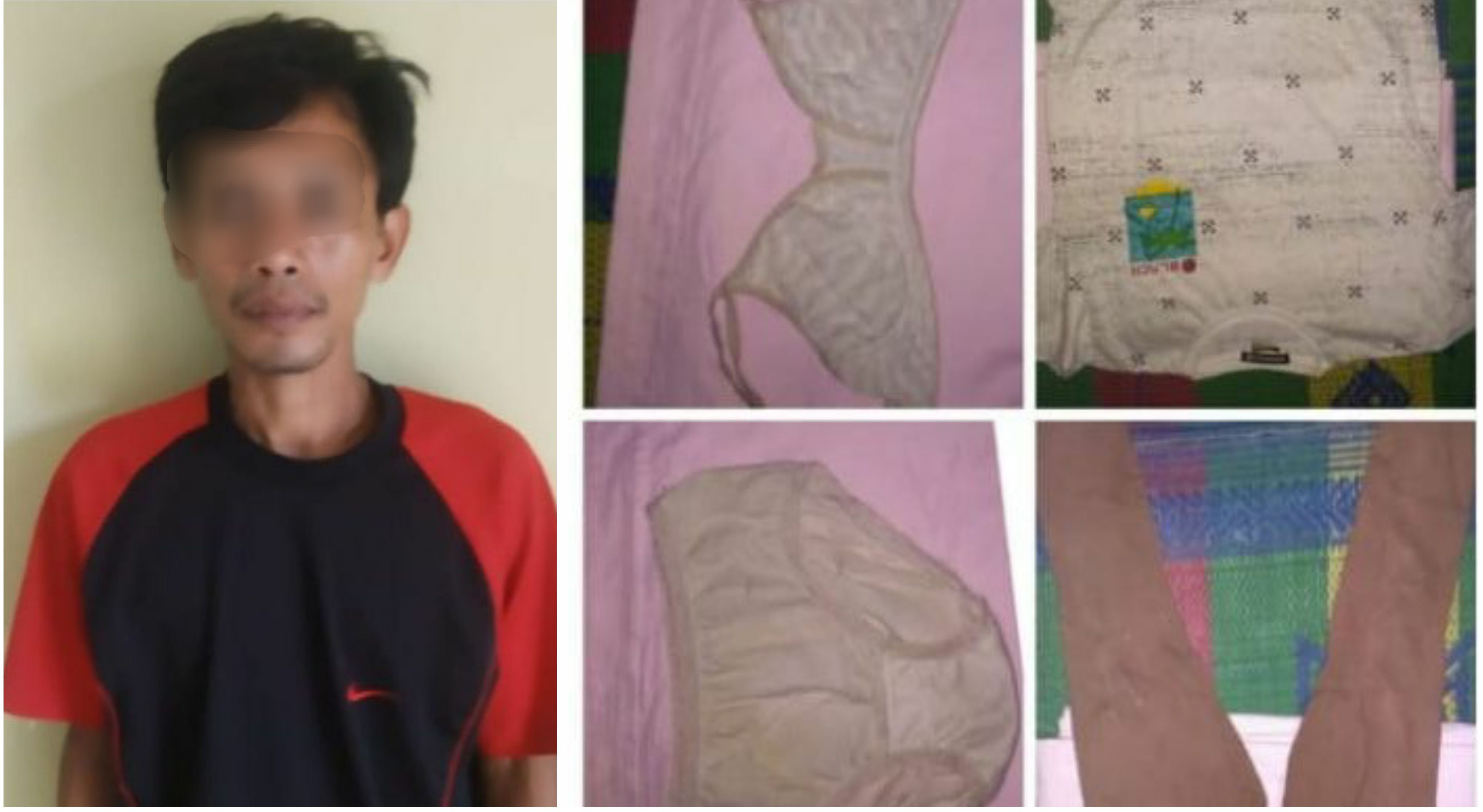 Selain mengamankan pelaku, petugas juga mengamankan barang bukti satu helai baju Baju kaos warna putih corak hitam ada gambar pohon kelapa, selai celana panjang warna coklat, satu helai celana dalam warna putih, satu helai BH warna putih garis-garis.(Diq)