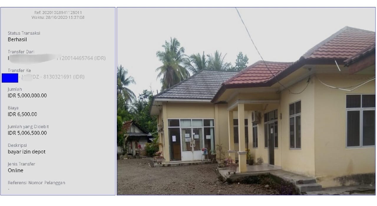 Adanya dugaan pungli tersebut diperkuat oleh adanya sebuah bukti transfer tertanggal 28 Oktober 2020 pada jam 15:37:08, sebesar Rp 5 Juta dengan Deskripsi Bayar Izin Depot yang ditransfer oleh pengusaha depot kayu berinisial IS (57) kepada pemilik rekening salah satu bank swasta atas nama H selaku oknum DPMPTSP DPMPTSP Kabupaten Lahat.