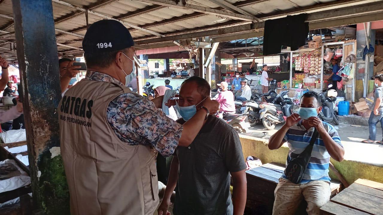 Dinas perdagangan Kabupaten Ogan Komering Ilir bersama Satuan Polisi Pamong Praja dan Damkar OKI mendisiplinkan para pedagang dan pengunjung pasar Kayuagung, Jum’at (25/6).