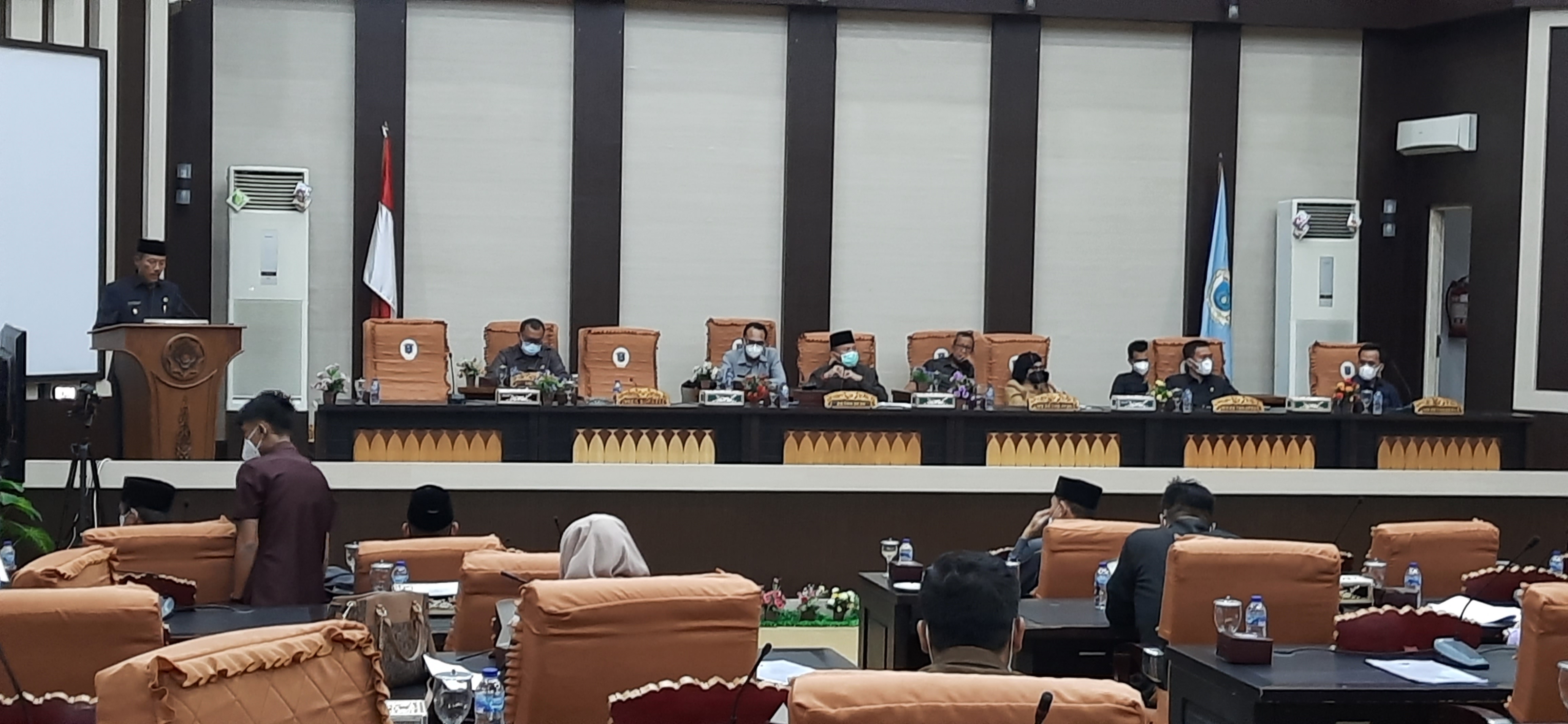 Photo : Wakil Bupati OKI HM Dja’far Shodiq menyampaikan Nota Pengantar KUA PPAS APBD OKI 2022 dalam sidang Paripurna, Jumat (16/7/2021).