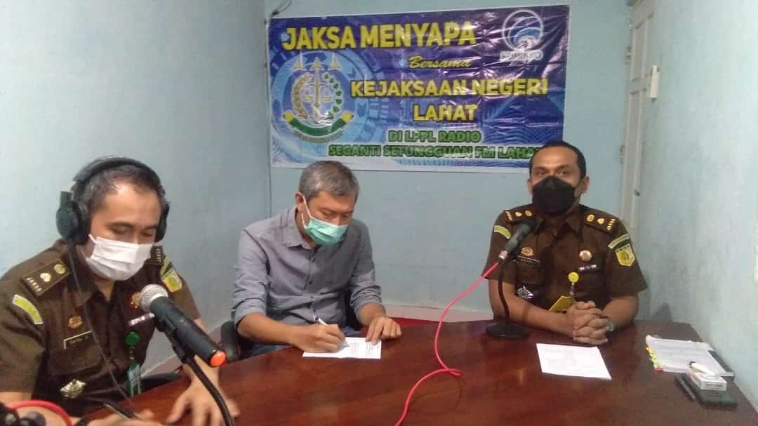 Lahat, Radarsriwijaya.com – Lembaga Penyiaran Publik Lokal Radio Seganti Setungguan FM Lahat menyiarkan acara dialog ” Jaksa Menyapa” dengan judul ” Peran Jaksa Pengacara Negara dalam Pelaksanaan Tupoksi Kejaksaan” disiarkan langsung dari Studio di Jalan Bhayangkara No. 1 Kelurahan Bandar Jaya Lahat, Kamis, 26 Agustus 2021.