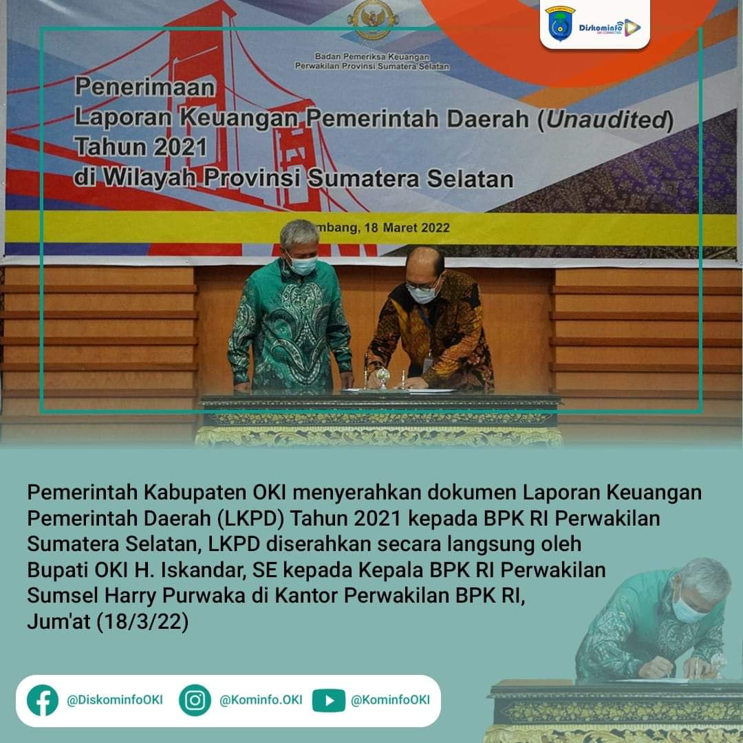 Radar Sriwijaya, OKI – Pemerintah Kabupaten Ogan Komering Ilir menyerahkan dokumen Laporan Keuangan Pemerintah Daerah (LKPD) Tahun 2021 kepada BPK RI Perwakilan Sumatera Selatan,