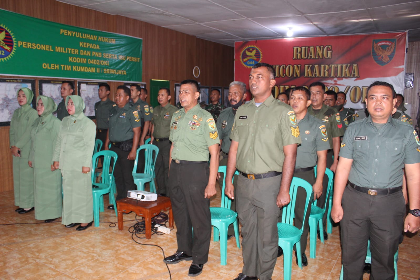 Ketua Tim Penyuluhan hukum Kumdam II/Sriwijaya yang diwakilkan Kakumrem 044/Gapo berharap melalui kegiatan penyuluhan ini tingkat pelanggaran dan permasalahan hukum militer dapat dipahami sesuai dengan aturan yang berlaku dan anggota militer maupun PNS serta Persit dapat meminimalisasi angka pelanggaran satuan di jajaran Kodam II/Sriwijaya Terutama di Kodim 0402/OKI.