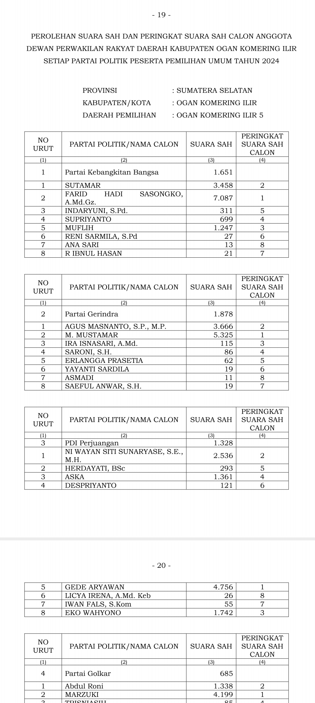 Jika merujuk pada keputusan KPU OKI nomor 1997 tahun 2024 tertanggal 4 Maret 2024 maka nama-nama partai politik termasuk caleg yang meraih suara terbanyak sudah bisa didapatkan diseluruh daerah pemilihan (dapil) dikabupaten OKI, tak terkecuali di dapil 5 yang meliputi kecamatan Mesuji, Mesuji Raya dan Mesuji Makmur.