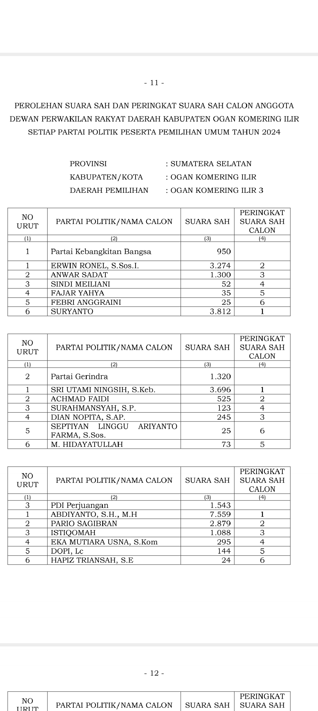Untuk perolehan suara masing-masing calon legislative (caleg) terutama tingkat Kabupaten OKI sudah diketahui hasilnya, termasuk perolehan rangking partai maupun masing-masing caleg di daerah pemiihan dapil 3 yang meliputi Kecamatan Pangkalan Lampam, Tulung Selapan dan Air Sugihan dengan alokasi sebanyak 6 kursi.