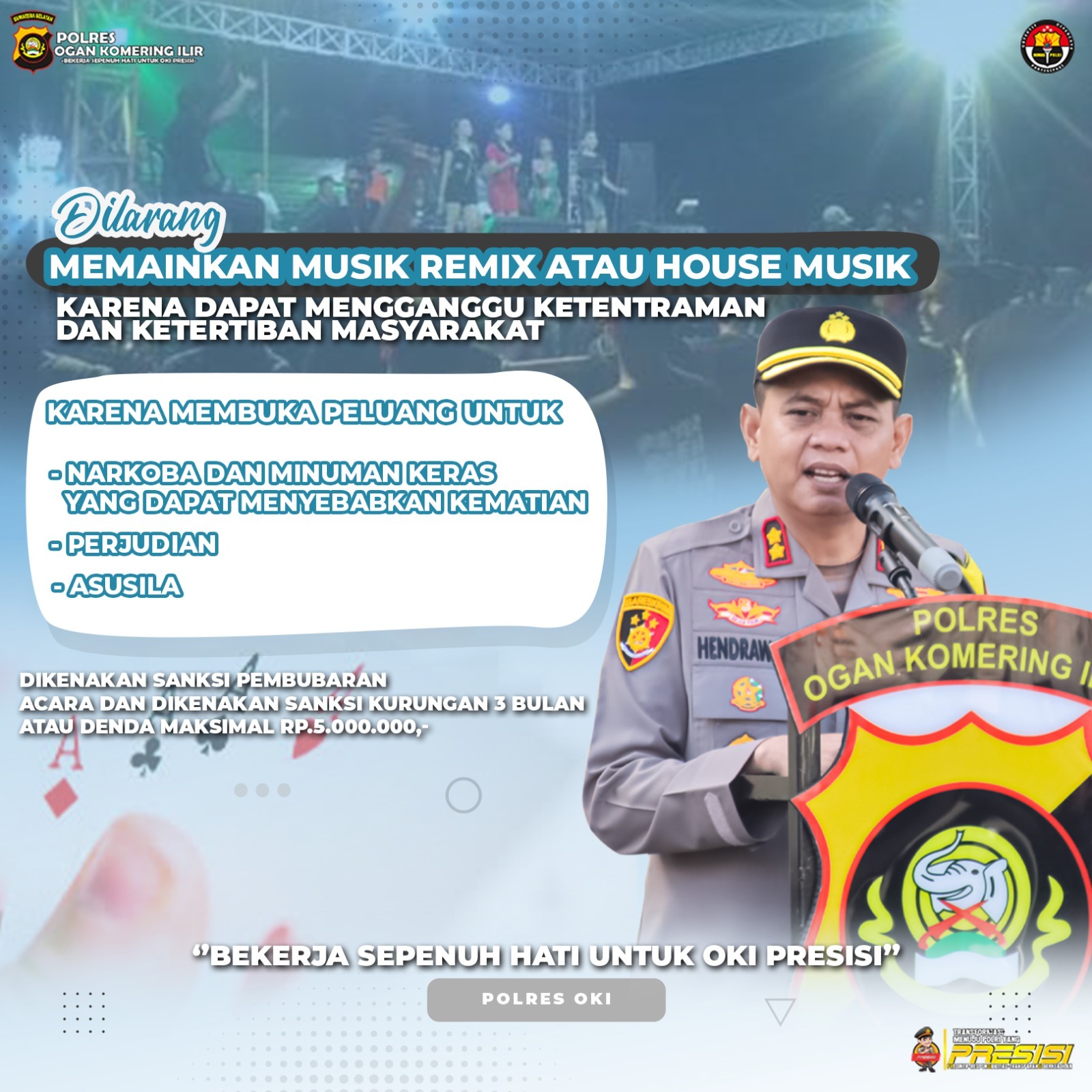 Kepolisian Resort (Polres) Ogan Komering Ilir (OKI) secara tegas mengeluarkan larangan memainkan pada kegiatan atau keramaian di wilayahnya.