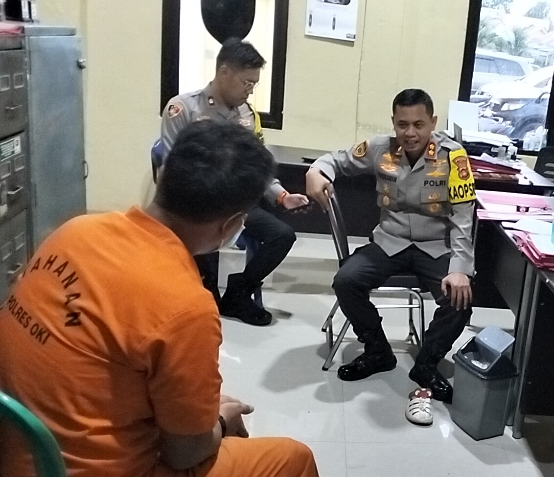 Caption: Kapolres OKI AKBP Hendrawan Susanto SH Sik didampingi Wakapolres Kompol Faisal tampak berbicara dengan pelaku Candra.(photo/dok.www.radarsriwijaya.com)
