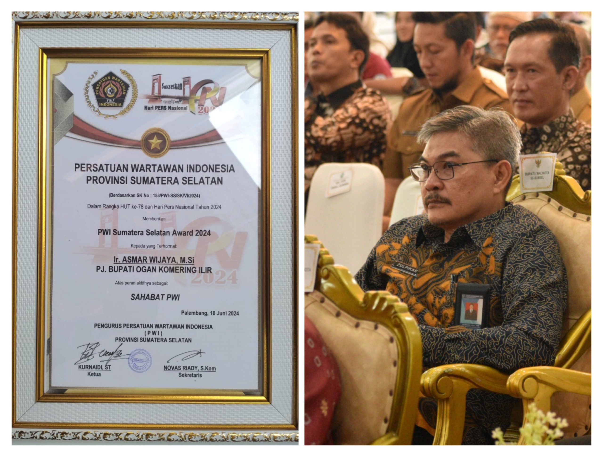 Radarsriwijaya.com (Palembang).- Pada puncak peringatan Hari Pers Nasional (HPN) 2024 yang diadakan di Griya Agung Provinsi Sumatera Selatan, Senin, (10/6) menerima penghargaan Sahabat PWI dari Persatuan Wartawan Indonesia (PWI). Penghargaan ini diberikan sebagai bentuk apresiasi atas komitmen dan dukungan Pj Bupati OKI, Asmar Wijaya terhadap kemajuan pers dan jurnalisme di daerahnya.