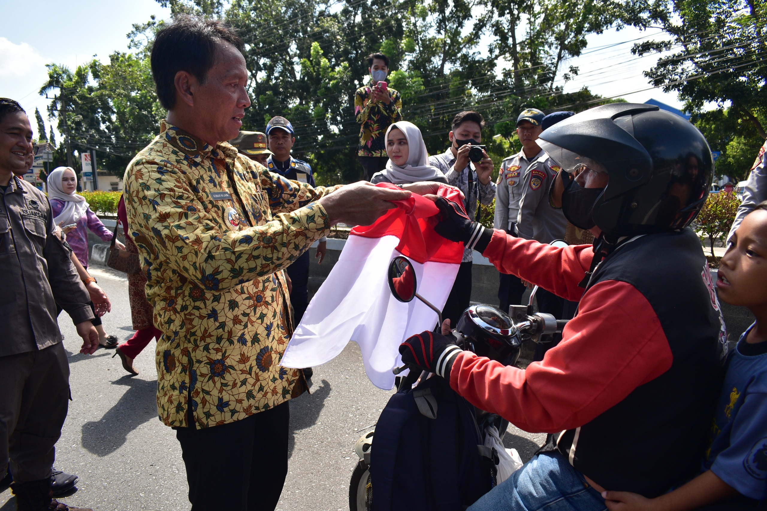 Caption : PJ Bupati Ir Asmar Wijaya M.Si menyerahkan bendera merah putih kepada salah seorang pengendara.
