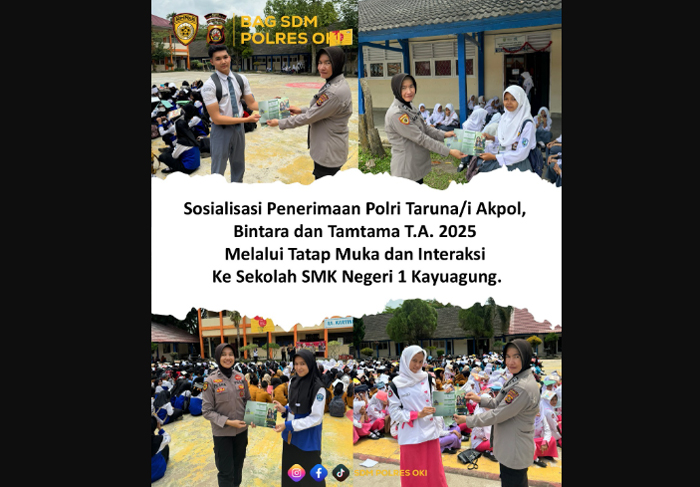 “Ya, tiap hari Polres OKI ke SMA/SMK. Dimana pada hari ini ke SMK Negeri 1 Kayuagung. Kita melaksanakan kegiatan kampanye proaktif sosialisasi penerimaan terpadu anggota Polri tahun 2025 Kabupaten OKI,” ujar Kapolres OKI AKBP Hendrawan Susanto melalui Kabag SDM Kompol Hendra Gunawan.