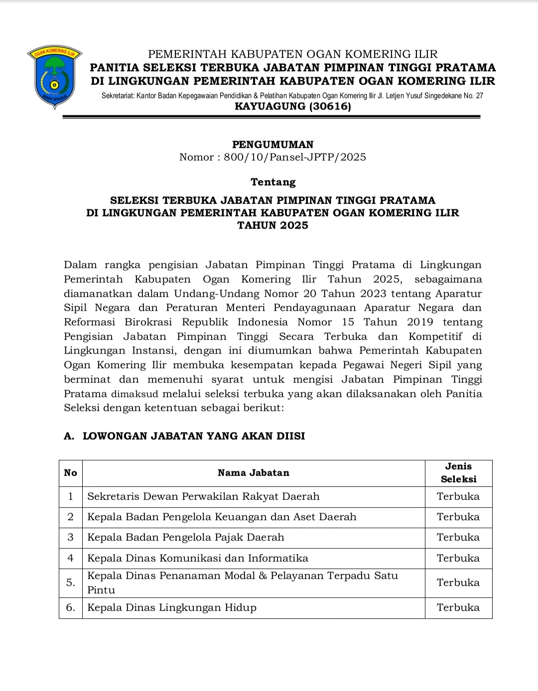 Caption : Pengumuman Seleksi Terbuka Jabatan Pimpinan Tinggi Pratama (JPTP) Pemkab OKI Tahun 2025