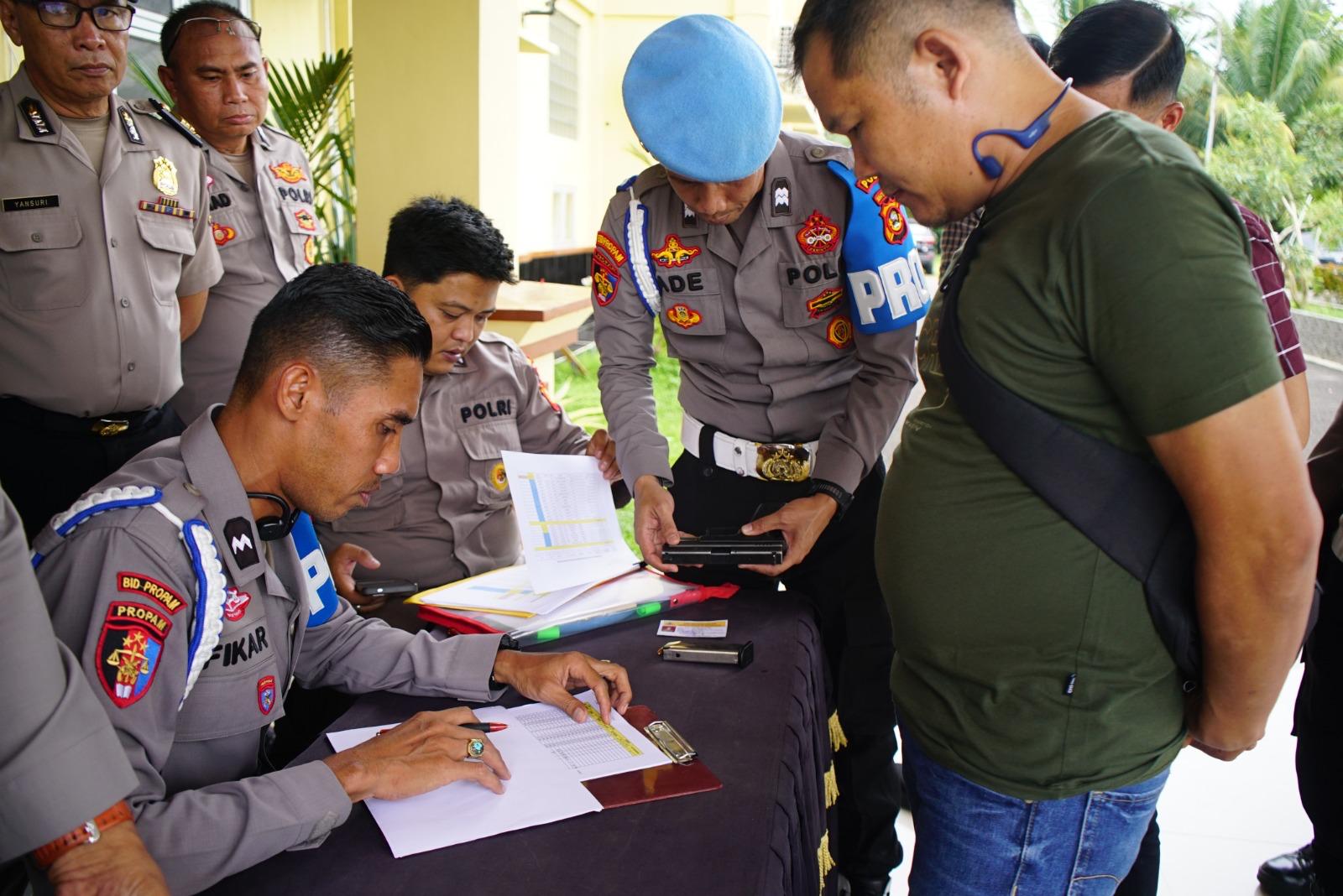 Caption : Kegiatan pemeriksaan dan pengecekan Senpi oleh jajaran Propam Polda Sumsel.